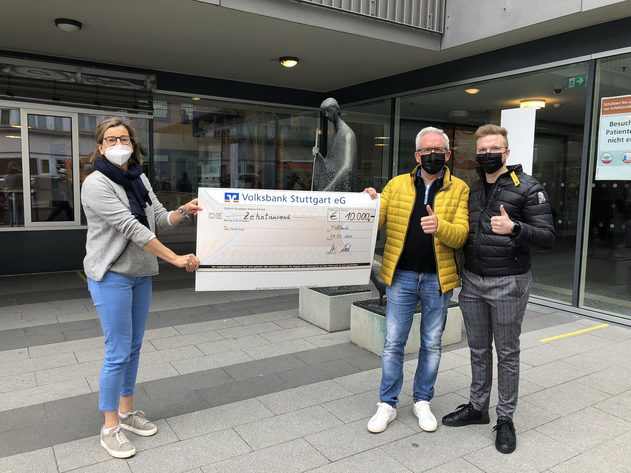 Uwe und Kevin Schaal übergaben kürzlich den Spendenscheck vor dem Olgahospital an unseren geschäftsführenden Vorstand Felicitas von Hülsen. Sie dankte den beiden sehr herzlich für ihre tolle Idee „Unternehmerisches mit Sozialem“ zu verbinden sowie für die großzügige Spende zugunsten der kranken Kinder im Olgahospital.