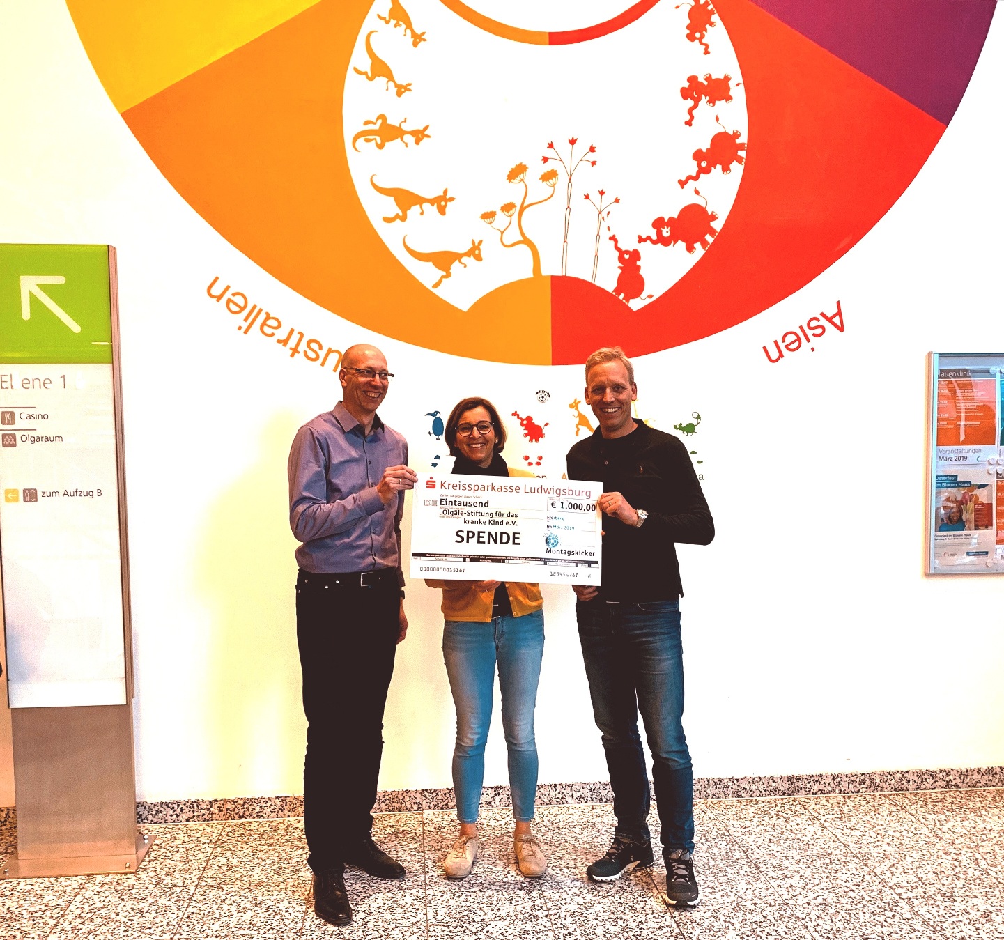 Am 25. März 2019 besuchten Tim Merkle (rechts) und Markus Schunter (links) vom Vorstand der Moki e.V. das Olgäle und brachten einen Scheck mit. Die Spende kam aus einem Fußballspiel der Montagskicker. Zusätzlich übergaben sie noch eine große Kiste voller Playmobilfiguren für die kleinen Helden auf den Stationen.