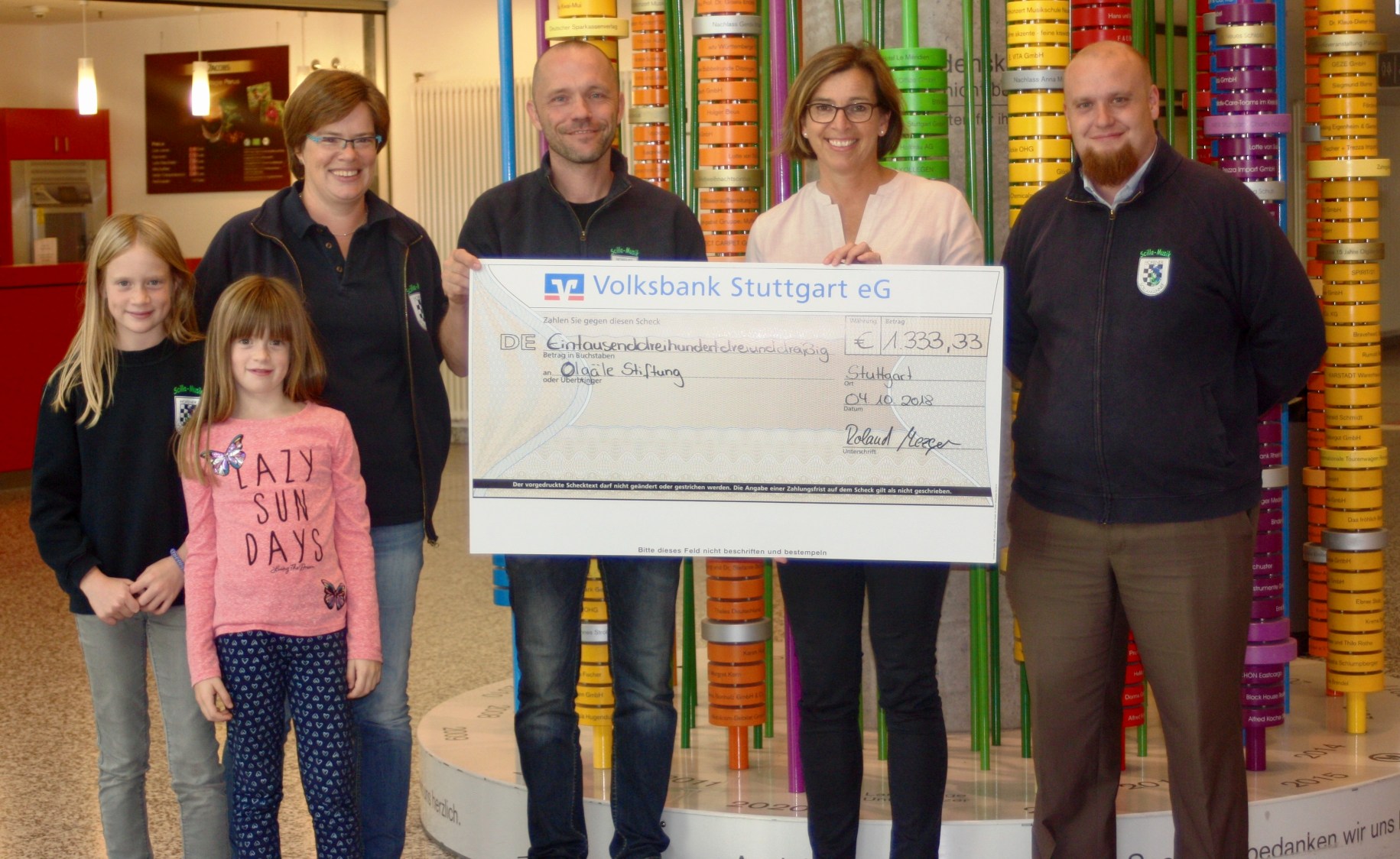 Die Hofener Scillamännle e.V. haben die Herausforderung der Fellbacher Weingeister zur „Cold Grillchallenge“ während der letzten Kampagne angenommen. Anstatt sich jedoch in Badeklamotten an den Grill zu stellen, wurden alternativ fleißig Spenden für einen guten Zweck gesammelt. Hierbei ist ein stolzer Betrag von 1.333,33 €uro zusammengekommen! Als Spendenempfänger wurden die Klinikclowns des Stuttgarter Kinderkrankenhauses „Olgäle“ ausgewählt. Am 4. Oktober 2018 wurde der Schecks durch eine kleine Abordnung der Scillamusik an Frau von Hülsen im Olgäle übergeben.