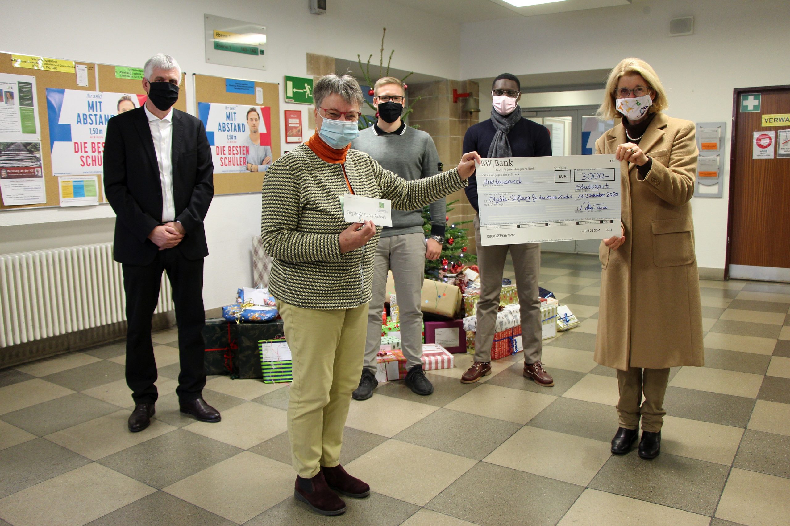 Die Olgäle-Stiftung für das kranke Kind e.V. konnte sich im Dezember über eine Spende der Kaufmännischen Schule 1 in Stuttgart freuen. Die Schule unterstützt die Olgäle-Stiftung bereits seit vielen Jahren und auch 2020 spendete sie wieder zugunsten der kranken Kinder. Der Schuldirektor Uwe Peleikis übergab kurz vor Weihnachten gemeinsam mit Frau Dorothea Zeller-Taiwo, Abteilungsleiterin VSG, sowie zwei Vertretern der SMV, Schulsprecher Terry Lloyd Offei und seinem 1. Stellvertreter Richard Stoppel, den Spendenscheck an Stiftungspräsidentin Dr. Stefanie Schuster. Die Olgäle-Stiftung bedankt sich ganz herzlich im Namen der kranken Kinder im Olgahospital für die langjährige Unterstützung!