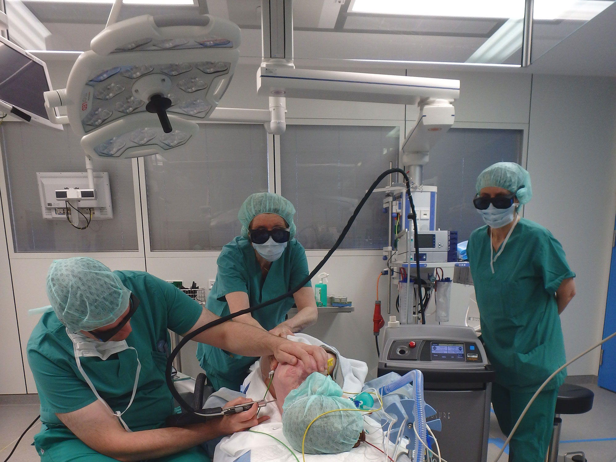 Dank vieler Spenden konnten wir, nach einem fraktionierten CO2-Laser vor fünf Jahren, der Kinderchirurgie jetzt zusätzlich einen gepulsten Farbstofflaser zur Laserung von angeborenen Gefäßfehlbildungen und Verbrennungen zur Verfügung stellen. Nach schweren Verbrühungen oder Verbrennungen muss die abgestorbene Haut abgetragen werden. Oft sind Hauttransplantate erforderlich, die bei manchen Kindern zu teilweise heftig juckenden und entstellenden Narbenwucherungen führen. Die Kinder sind für ihr Leben gezeichnet. Dr. Stefanie Schuster und Susanne Dieterich überzeugten sich im OP von der erfolgreichen Behandlung eines siebenjährigen Jungen durch den Geschäftsführenden Oberarzt Dr. Torsten Hannmann.