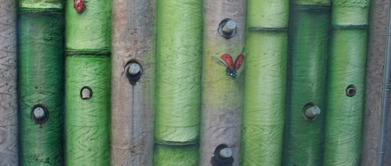 Der Olgäle-Stiftung war es von Anfang an ein Anliegen, die graue, abweisende Betonpfahlwand dicht hinter dem Olgahospital in einen attraktiven Blickfang zu verwandeln. Ein bislang trister, deprimierender Anblick für die Patienten, Eltern und Mitarbeiter der Kardiologie und der Intensivstation. Die Hamburger Künstlerin Brigitta Höppner hat dieses schwierige Projekt mit Unterstützung des Architekten Jochen Schaible ansprechend gestaltet. Über 15 m x 150 m erstrecken sich Bambusrohre, die eine beeindruckende Plastizität besitzen. Ab und zu „verirrt“ sich ein kleiner Marienkäfer fliegend oder krabbelnd in diesen Bambushalmen, so dass die kleinen Patienten aus ihren Fenstern diese fröhlichen Glücksbringer entdecken können.
